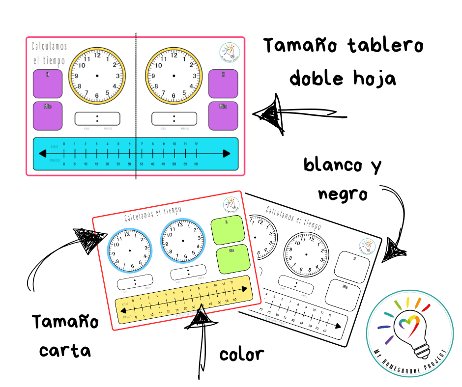 Ahora sí, vayamos al asunto de este post! Hacer ejercicios de cálculos de tiempo con el reloj. Como ya te mencioné antes, puedes abordar esto desde la cotidianidad en las tareas del día a día, a la hora de cocinar; en los trayectos de un sitio a otro; con el horario de rutinas; con la programación de cualquier evento, etc. Pero también podemos hacer ejercicios aterrizados en el cuaderno utilizando material que les permita manipular y comprender más fácilmente el concepto de tiempo.