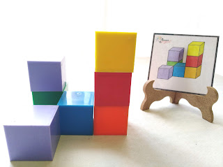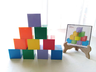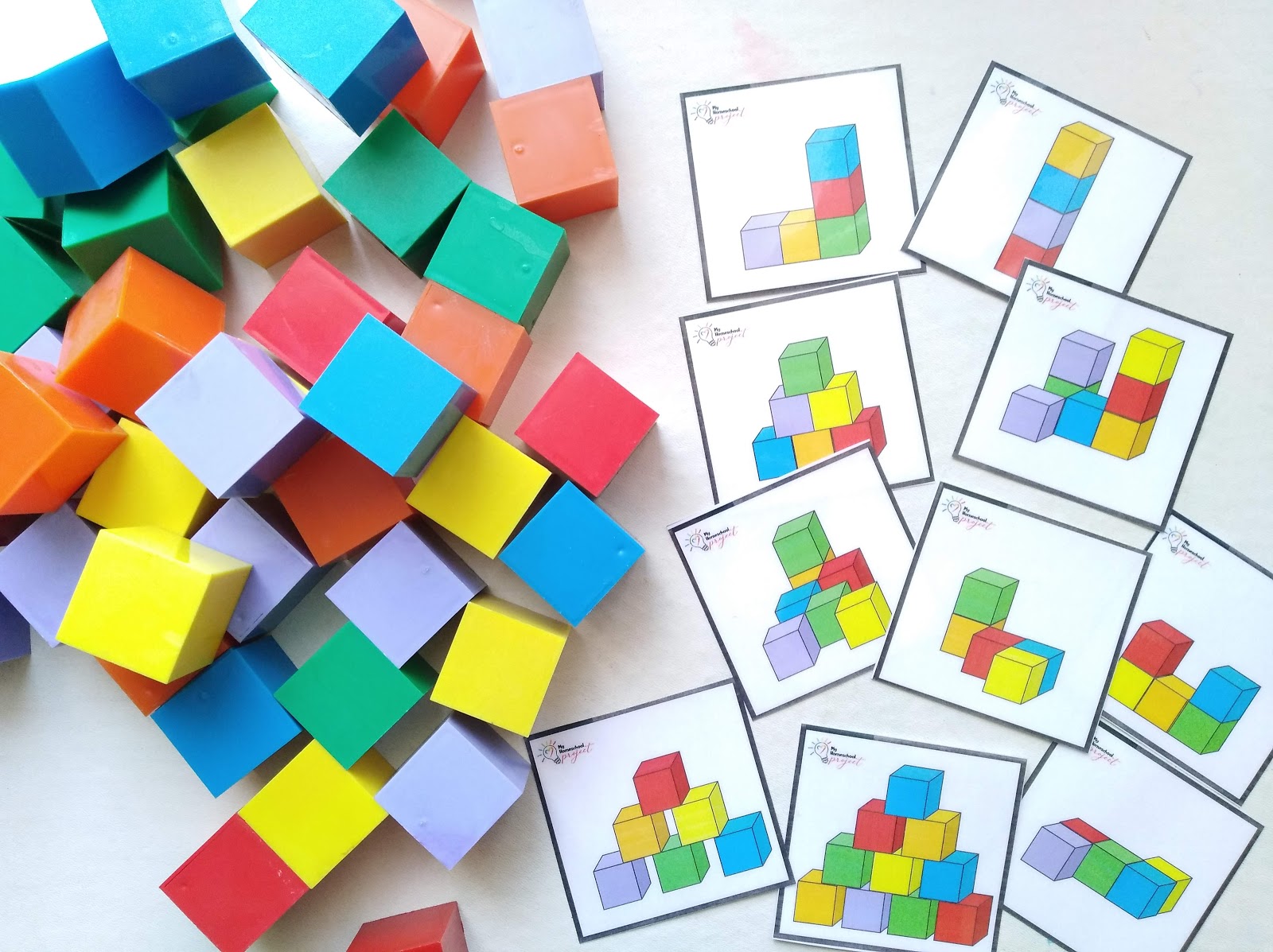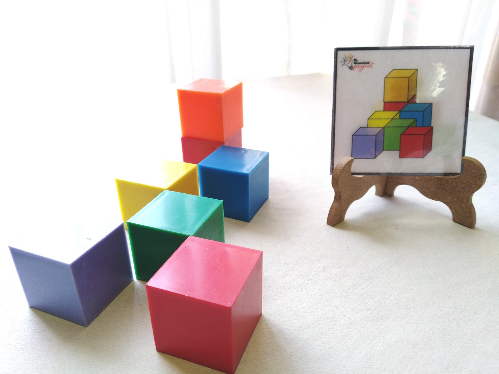 La actividad consiste en colocar los cubos según su color y posición en el arreglo indicado en la tarjeta, con esto el niño trabaja en el desarrollo de la percepción espacial además de sus habilidades motrices.