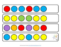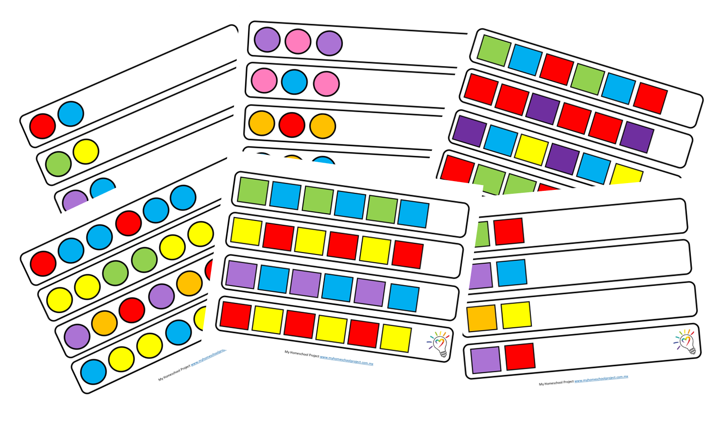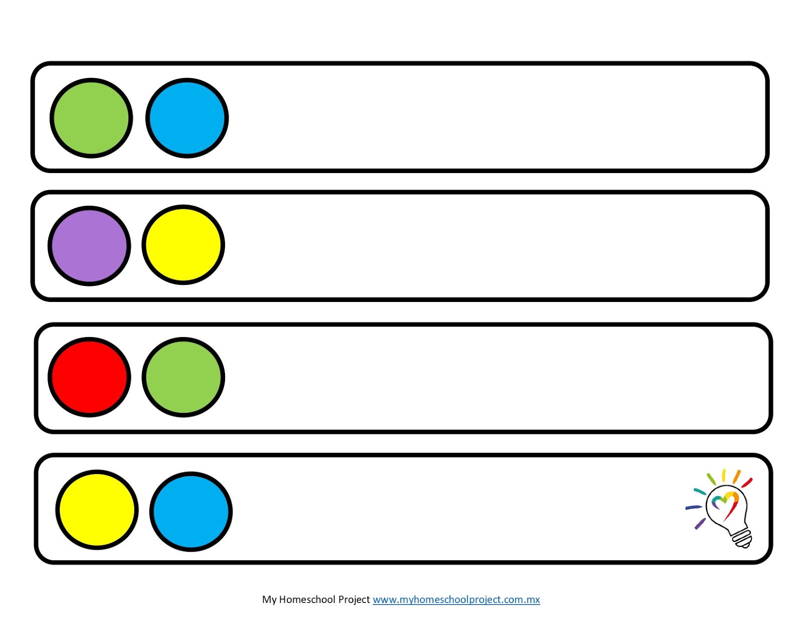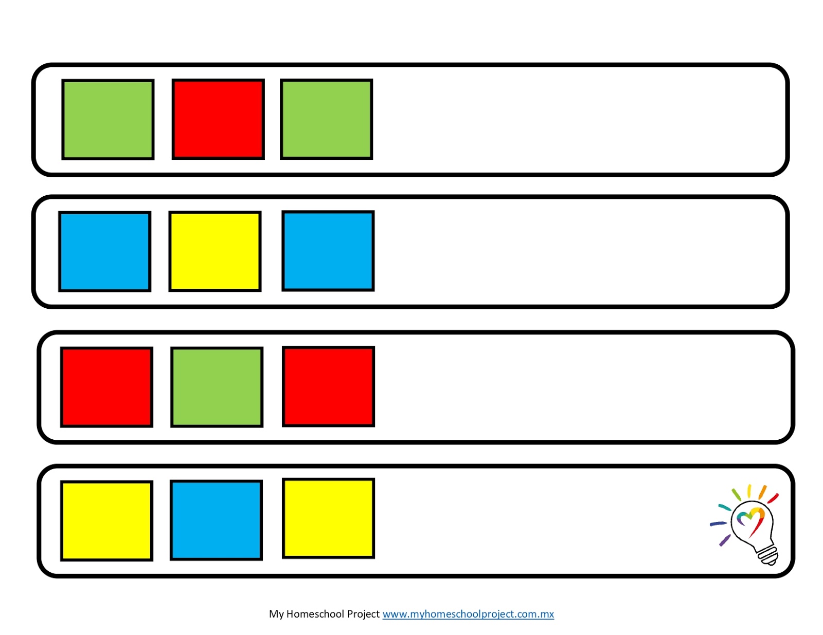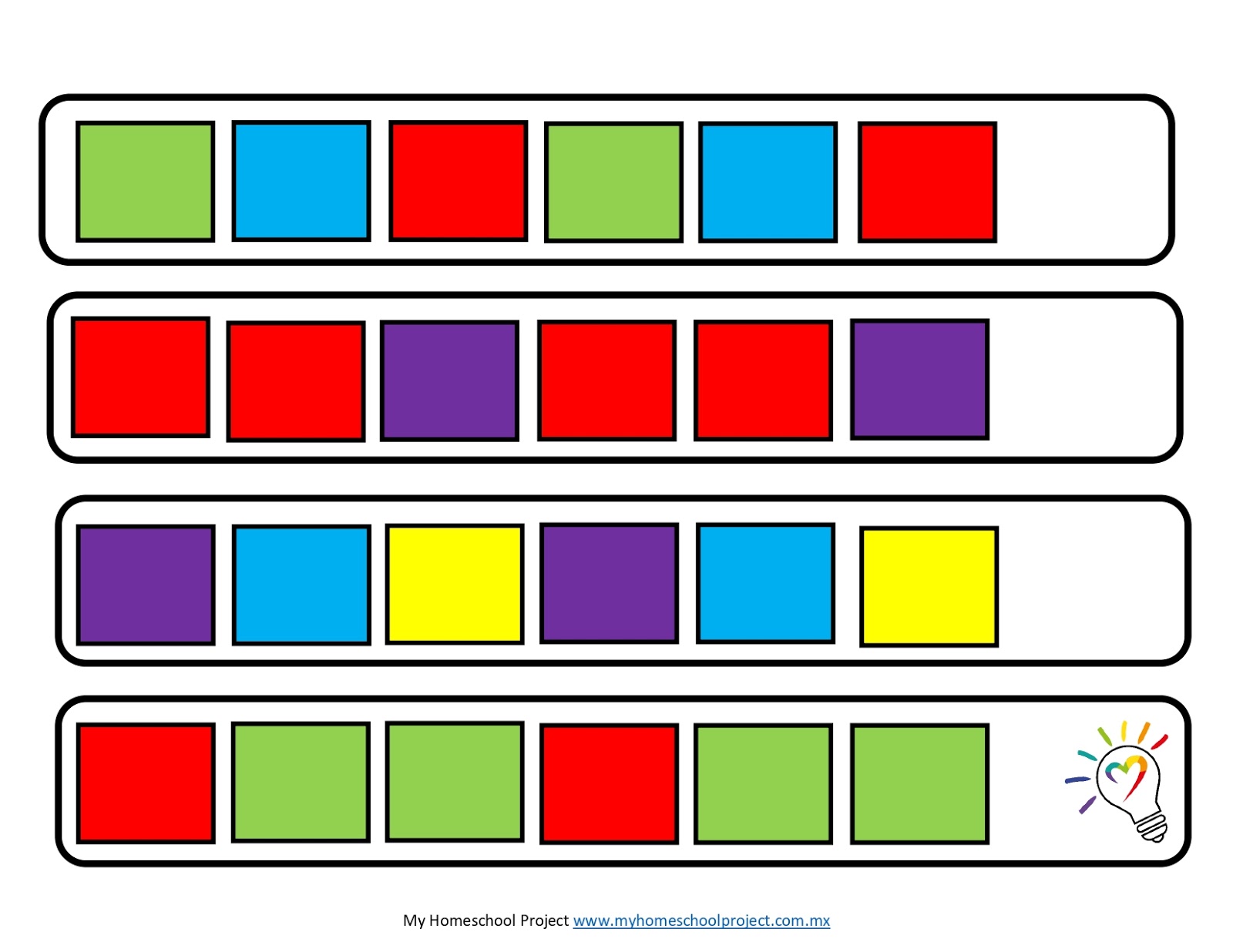 En esta ocasión tengo estas plantillas para trabajar las secuencias de colores, puedes utilizar cualquier objeto de dichos colores que ya tengas en casa, como pompones, piedras, cubos, legos, plastilina, etc.